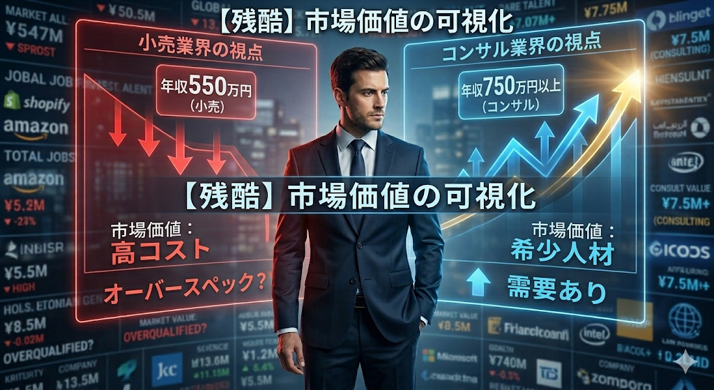 例: 前職で年収550万円、実績も十分。しかし、小売業界では「その年収は高い」と敬遠され、コンサル業界へスライドすれば「即戦力として喉から手が出るほど欲しい」と言われる。